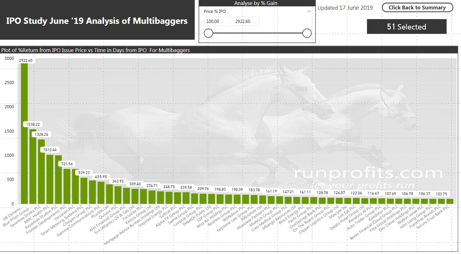 This comes back to the original question; should I take a stake in an IPO placing and is there really a danger of missing out? Only a few of the multibaggers ever got cheaper than their initial placing IPO price but all of them went on to make most of their returns several years after their placing dates. Relative to the rewards offered later on, the difference between the issue price and prices in early years suggest it might make more sense to wait for performance in the market rather than buying in the placing (Figure 7.). Indeed. a number of IPOs which did go on to be multibaggers went through periods of underperformance in the initial years and did offer better buying opportunities (BOO, BLOW, LTG, WAND). This echoes Ben Graham’s observation that in the short-term markets tend to be voting machines while in the longer term they are weighing machines. While charts are always easier to read from right to left risk management using a stop-loss should work with the majority of nascent multibaggers