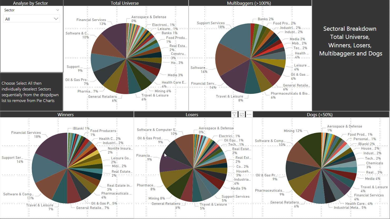 Figure 8 shows that more of the winners came from Financial Services, Support Services with an even more pronounced concentration of Support Services and Software companies in the multibaggers. Mining and oil and gas producer did concentrate in the losers with the ratio of mining doubling from 6% in the total universe to 12% in the dogs;