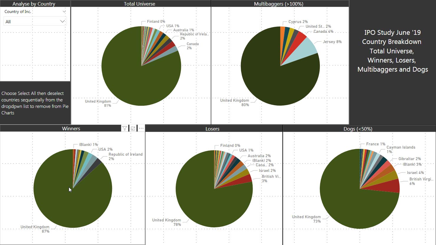 The total universe of 408 was analysed by sector country and market as were the winners and losers to examine sector and country over/under-performance. Junior oilers and miner are fairly notorious for overpromising and under-delivering with sometimes spectacular losses. Many investors will shun companies from some countries owing to track records of frauds and limitations on prosecution in the event of fraud.