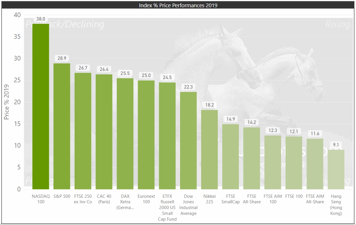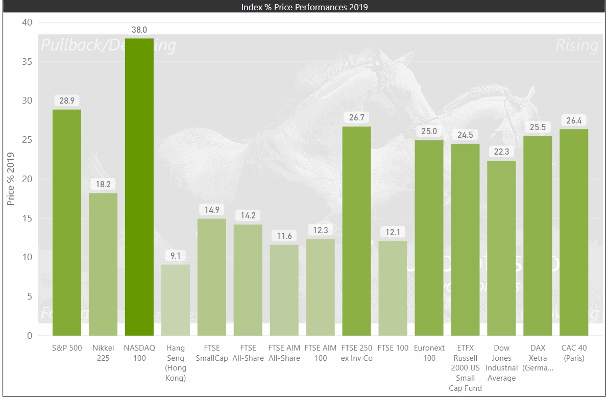 The performance data for UK indices, sectors and shares over 2019 is included in a fully interactive 56 page report which covers 1380 shares in the 41 UK sectors. This allows individual analysis and interrogation of the underlying data using powerful visual data mining techniques to enable bespoke research and data-driven insights. The report is available at the link below and will be referenced by all 3 articles and updated throughout 2020.