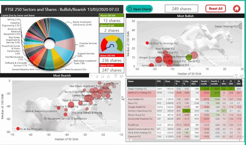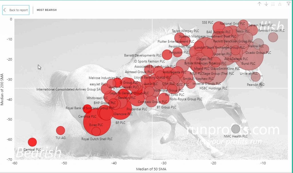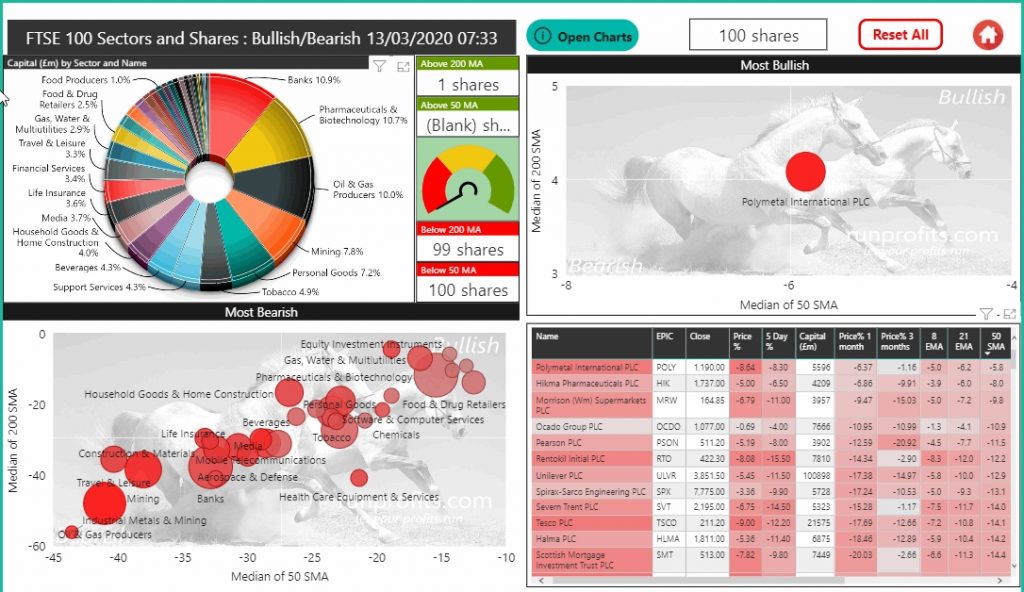 Expanding the bearish sectors in the FTSE 100 reveals the clustering of Travel and Leisure, Oil and Gas, Banking and Mining stocks which were most hit in this meltdown