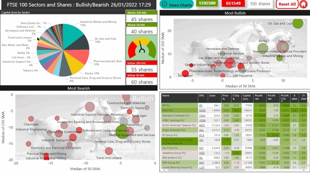 Oil is currently  around $90/bbl up from $78 at the start of Jan 22. Similar rises in the base metals have been bullish the miners while the expectation of rising interest rates in 22 has lifted the banks.