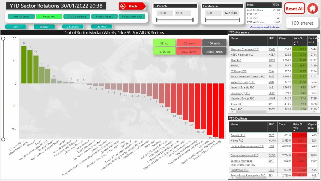 Given the negative start to 2022 in most stock markets, the FTSE 100 it is one of the few that is actually in the green YTD, up 1.1%. And while the top line is just over 1%, when you drill down you find a good few double digit gainers over the past few weeks-  the likes of BP, one of the biggest mega caps in the UK stock universe, up almost 20% since the start of the year. That's a huge amount of capital appreciation in a massively liquid stock that pays a hefty dividend.  In fact there are 11 names in the FTSE 100 up over 12% YTD while most small  and mid caps are getting crushed.