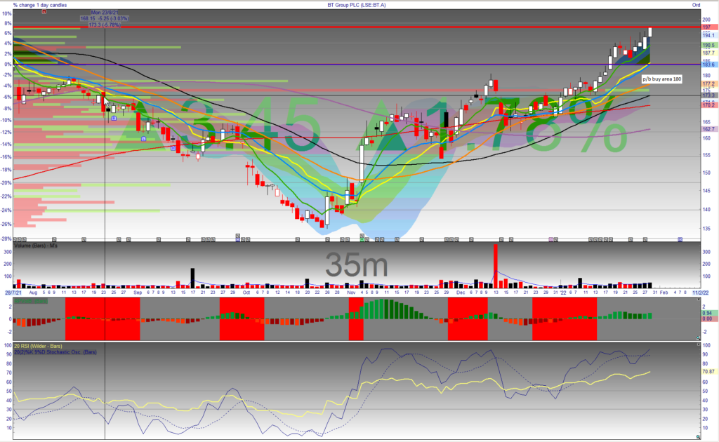 As an example, with the likes of TSCO, the VWAP also coincides with the 21EMA which is a 1 month price average. As a general rule of thumb, I tend to stay long MoMo shares like this until they have more than 2 closes below the 21 EMA . Three or more closes below the 21EMA on volume  normally signals a change in trend or loss of momentum . The exception to this is where the  50 MA is near in which case price may check this before rallying. In either case, levels are also set from  a money management and risk/reward  point of view with partial take-profits depending on the details of each trade and the time horizons. Over the coming week or so I will be doing deep dive analysis on a number of these names. For disclosure ,  I am long RDSB, SBRY, TSCO  NWG  . These are positions that have been in place since 2021 with the exception of NWG which is an initial position on the recent pullback