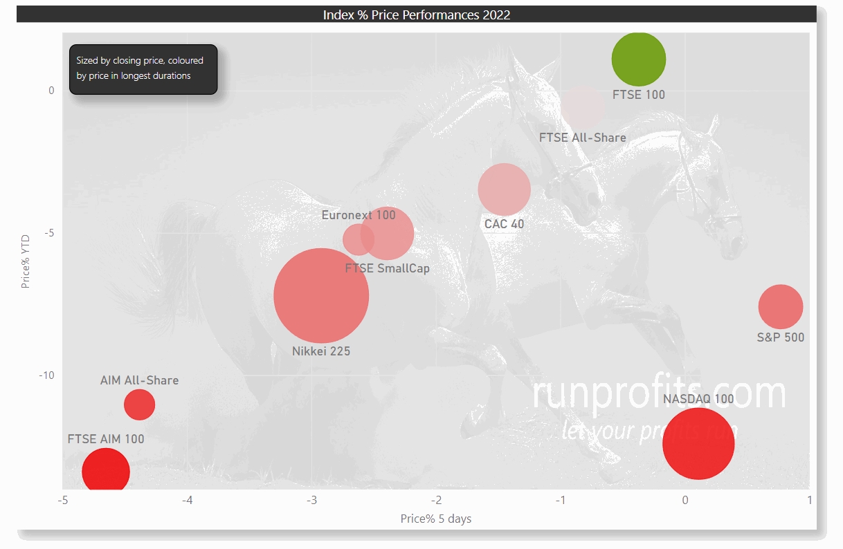 Given the negative start to 2022 in most stock markets, the FTSE 100 it is one of the few that is actually in the green YTD, up 1.1%. And while the top line is just over 1%, when you drill down you find a good few double digit gainers over the past few weeks-  the likes of BP, one of the biggest mega caps in the UK stock universe, up almost 20% since the start of the year. That's a huge amount of capital appreciation in a massively liquid stock that pays a hefty dividend.  In fact there are 11 names in the FTSE 100 up over 12% YTD while most small  and mid caps are getting crushed.