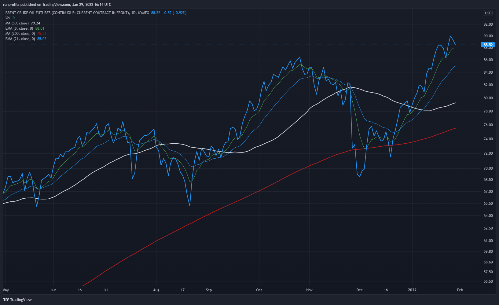 Oil is currently  around $90/bbl up from $78 at the start of Jan 22. Similar rises in the base metals have been bullish the miners while the expectation of rising interest rates in 22 has lifted the banks.