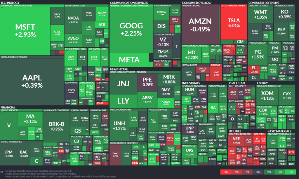 US Closed In green driven by a bounce in tech with Meta gaining 6.5% on rumours of significant cuts in employees this week : TSLA loses 5% in a much touted sell-off that looks set to become a crowded short