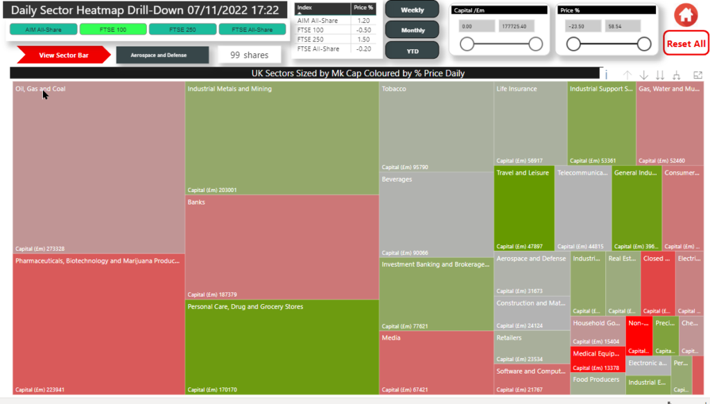 The daily sector heatmap shows Mining, Travel and Personal care/grocery in green while oil and gas took a pause