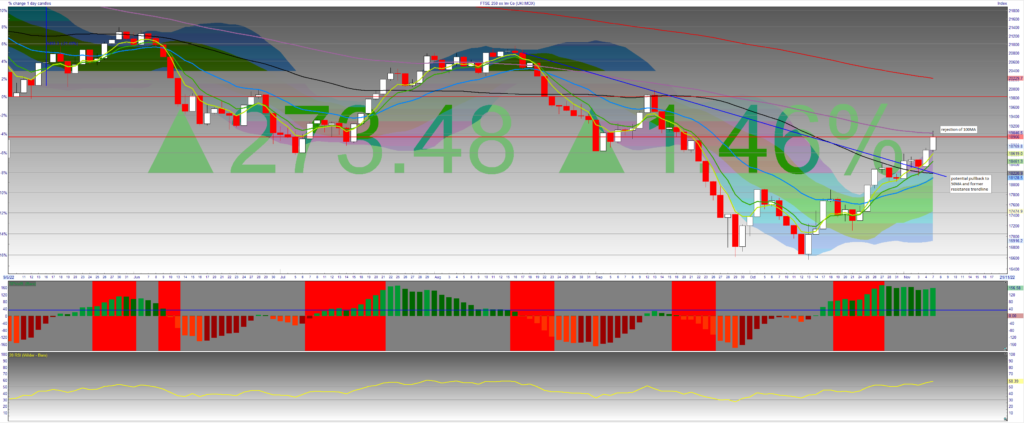 Mega cap positive momentum from Friday spread to mid and small caps: FTSE 250 rallied to the 100MA and rejected the level which may signal a pullback from the recent strong run: this may check back on the 50MA see chart