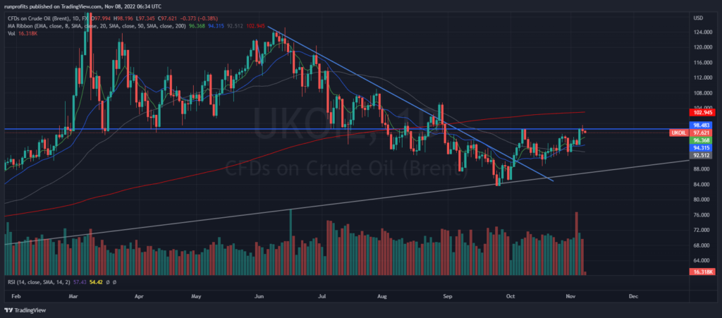 encountering overhead resistance around $97,which is proving a stubborn level : may pullback and consolidate around the 21EMA at $94.6: Oil is below its 200MA around $103 so may be prone to sharp downside moves