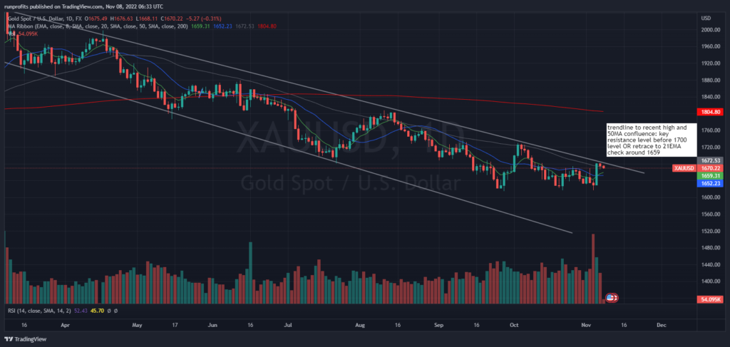 see resistance at the trendling back to the 2022 highs of : this is likely a consolidation of the 3% move last Friday before a renewed upthrust to break $1700 althugh a pullback to the 21EMA at 1652 wouldn't invalidate the breakout. Gold has very much mirrored the dollar moves : the DXY is at a key support trendline after pulling back sharply, a renewed upthrust in DXY will likely challene gold's rally although a decoupling would prove very bullish gold . I am long from the breakoout last Thursday so my bias may be skewed but I remain mindful of the broader trend and I am always happy to change my mind and book profits.
