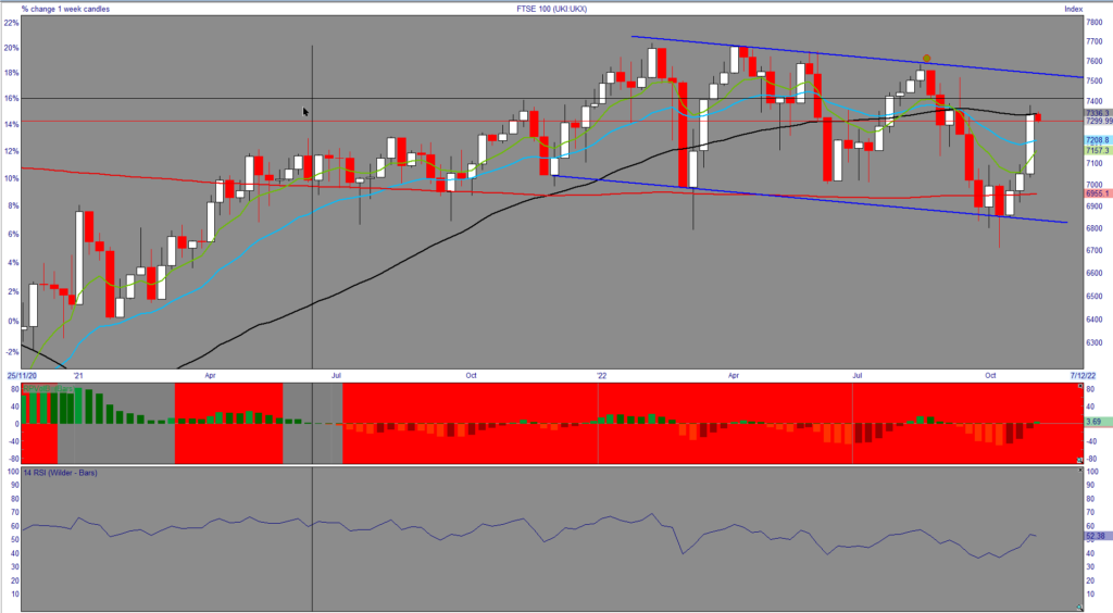FTSE Futures at 7266 off yesterday's close of 7300 after the mega caps failed to hold the 200MA at 7030. However this digestion of Friday's big move is a healthy sign in in an upward move that should see 7500 to reach the top of the channel in play since the start of 2022 assuming continued support from commodites and oil .