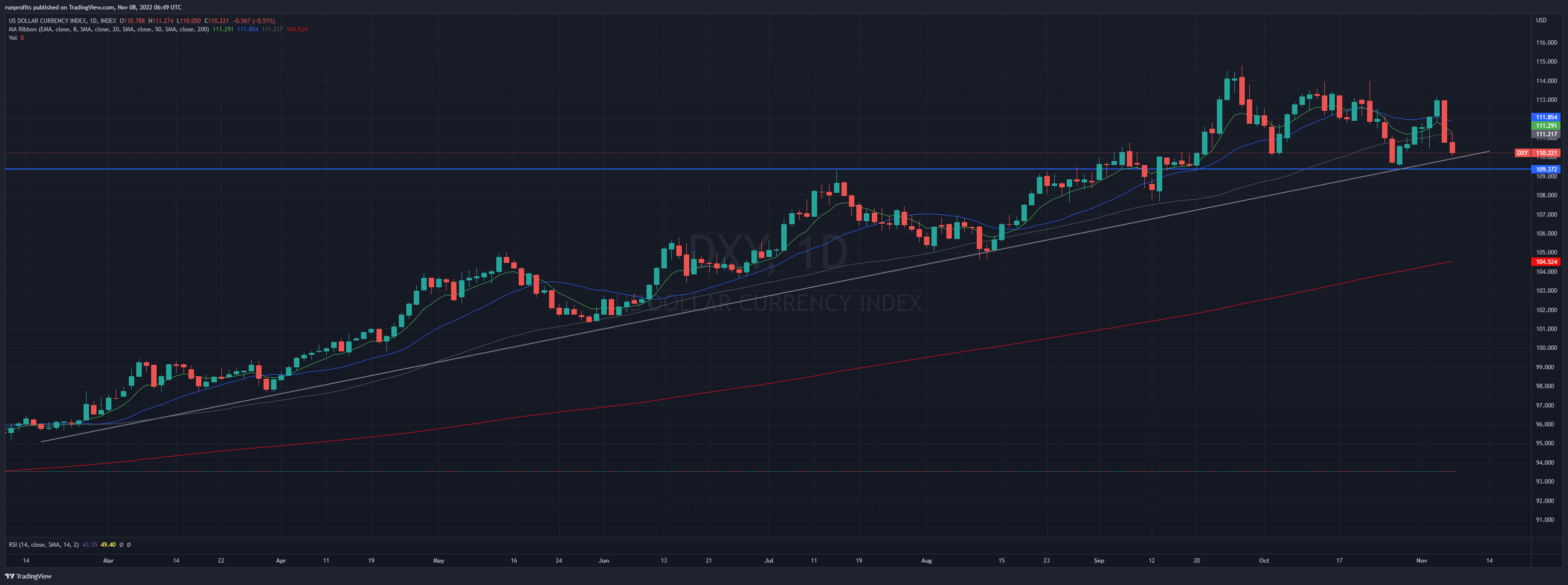 Dollar indext is back at the support trendling to the start of this major move: if this fails it is likley to be a very decisive moment for gold and risk assets though the macro favours it holding and the greenabck to move