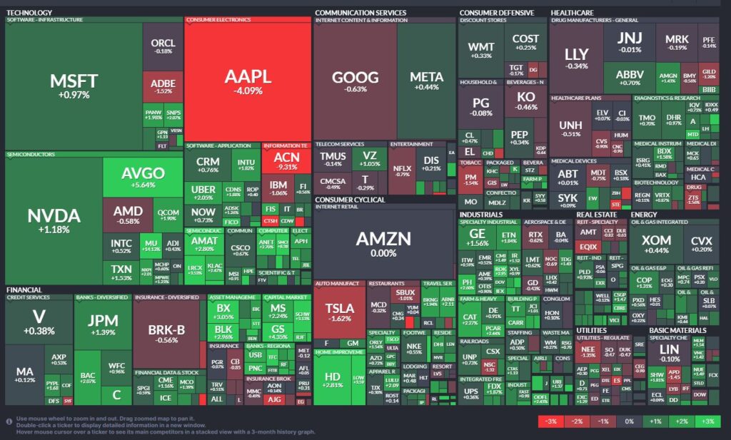 Despite the strength in the greenback, US indices saw fresh all-time highs with the S&P 500 adding 0.3% despite a sell-off of 4%  in Apple with the semiconductors reasserting leadership - see heatmap.