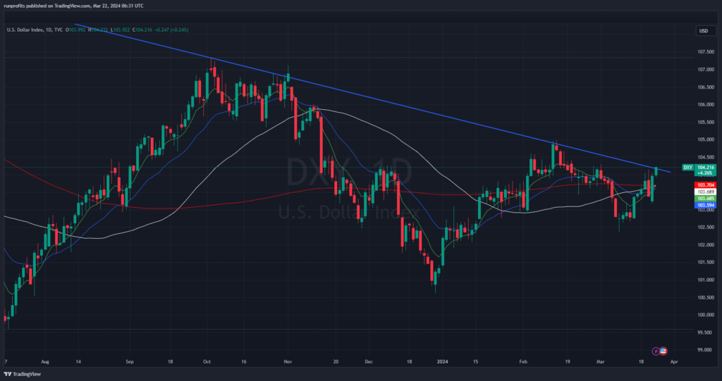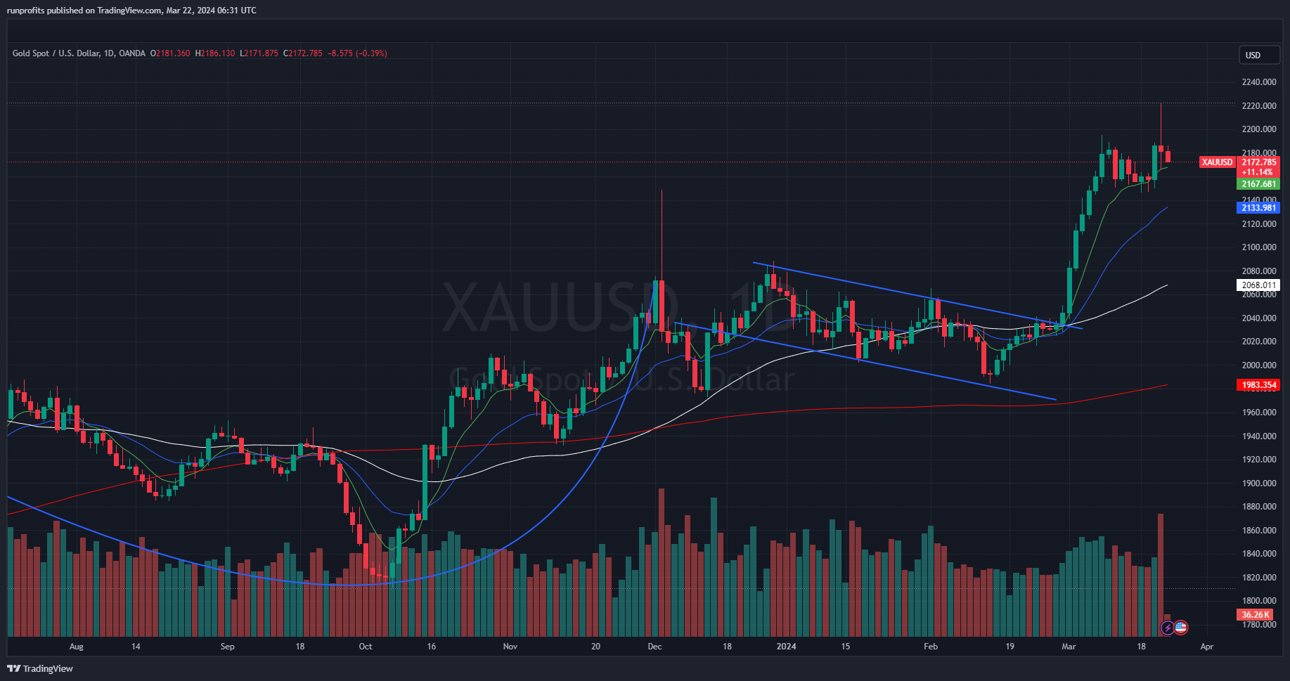 Dollar reasserts strength following the sell off from the FOMC meeting on Wednesday. Gold precious metals and copper all responded accordingly, with gold back around the 8 EMA at $2174 from a high yesterday  at almost $2230 (see charts). Uranium continues  to recover off its low of  $82 last week now eyeing $90 ,YCA, GCL  rallying this week as highlighted in the Weekly Wrap with MKA Mkango staging a breakout from base