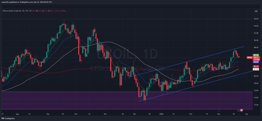 Brent oil has continued to pull back from the upper channel line around $87 - a 2024 high - currently sitting around the $85 mark on the 8EMA which may provide support - see Chart