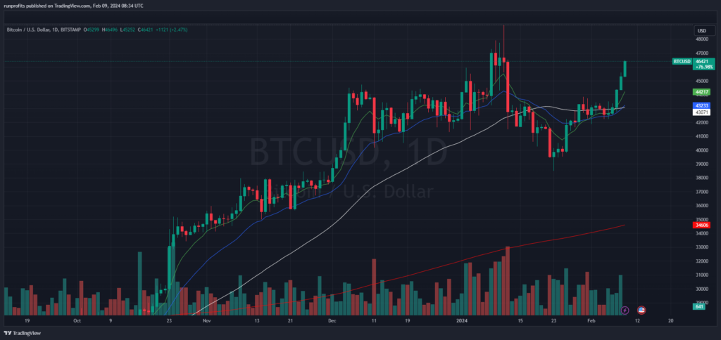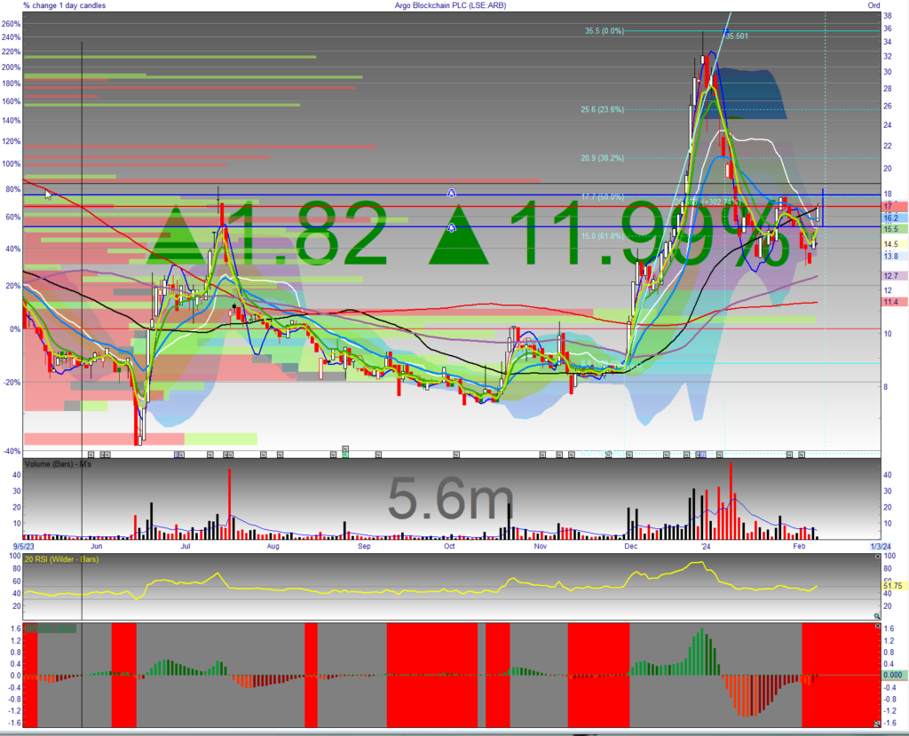 High spec play on the Bitcoin breakout as BTC has three consecutive big green days clearing $46000, ARB is poised to follow : two gaps on the charts with a vol squeeze in play offers a 17p entry with plenty of upside potential; order book looking healthy this am for a few trades into this . Not the prettiest chart and one I have traded many times in the past from 3p up to the dizzy 320p heights so plenty of overhead resistance . Healthy build-out in the volume profile from 13-17p should build a platform with overhead around 20p which may provide resistance then fairly clean air to 30p into the Dec '23 high around 36p which would likely see selling if tested. Move north obviously dependant on BTC performance