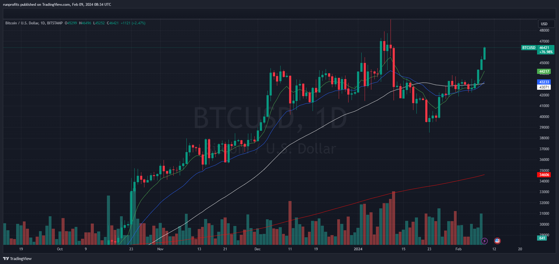 High spec play on the Bitcoin breakout as BTC has three consecutive big green days clearing $46000, ARB is poised to follow : two gaps on the charts with a vol squeeze in play offers a 17p entry with plenty of upside potential; order book looking healthy this am for a few trades into this . Not the prettiest chart and one I have traded many times in the past from 3p up to the dizzy 320p heights so plenty of overhead resistance . Healthy build-out in the volume profile from 13-17p should build a platform with overhead around 20p which may provide resistance then fairly clean air to 30p into the Dec '23 high around 36p which would likely see selling if tested. Move north obviously dependant on BTC performance