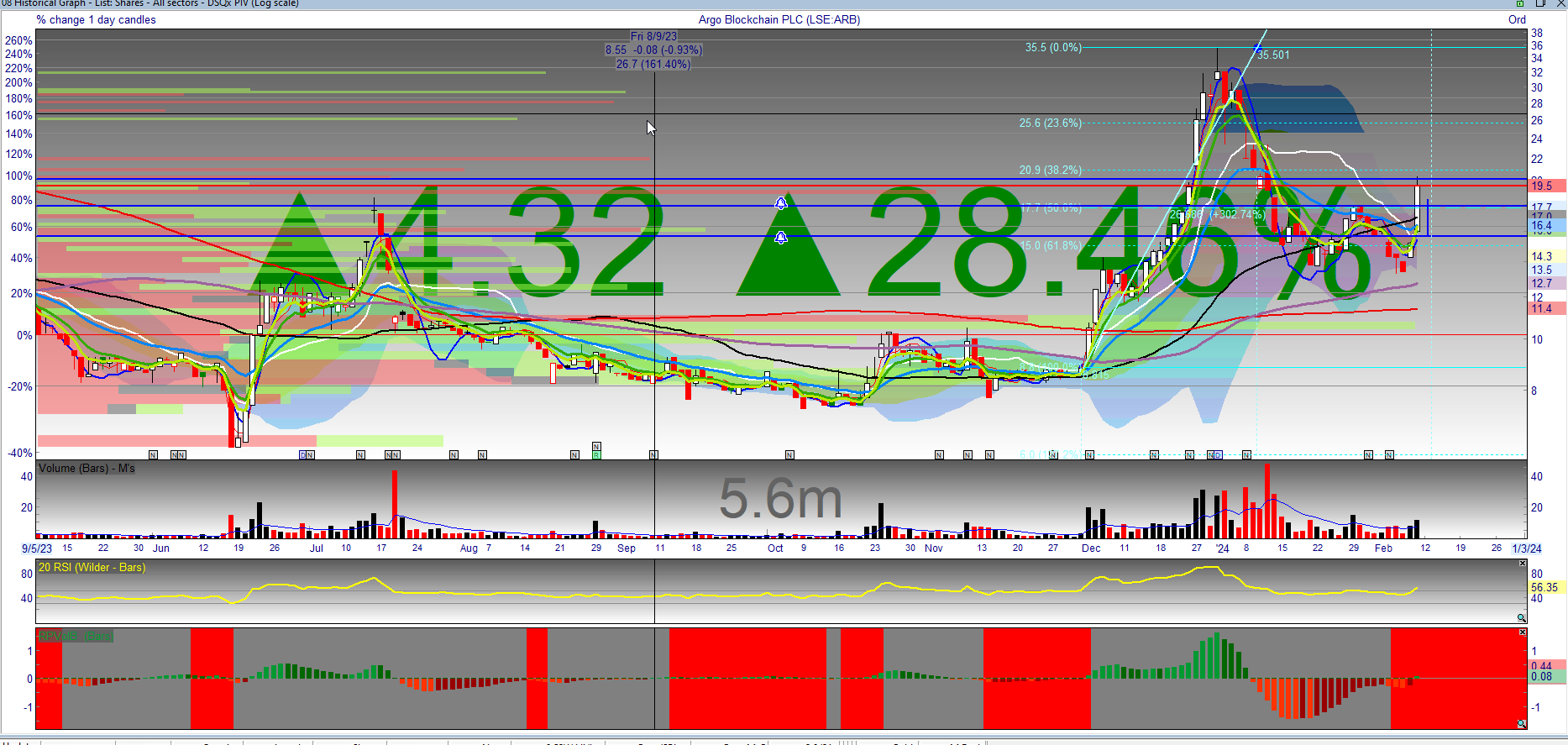 took off some Arb from the 17.0 Entry at 20p intermediate target for a partial take-profit as it was up 31% on the day and +22% from entry - allowing the rest to run : vol squeeze fired long confirmed on the daily so should continue north with potential opps to add ither on more strength or more likely from reloads off pullbacks to Fib retracements of the breakouts: analysis to follow