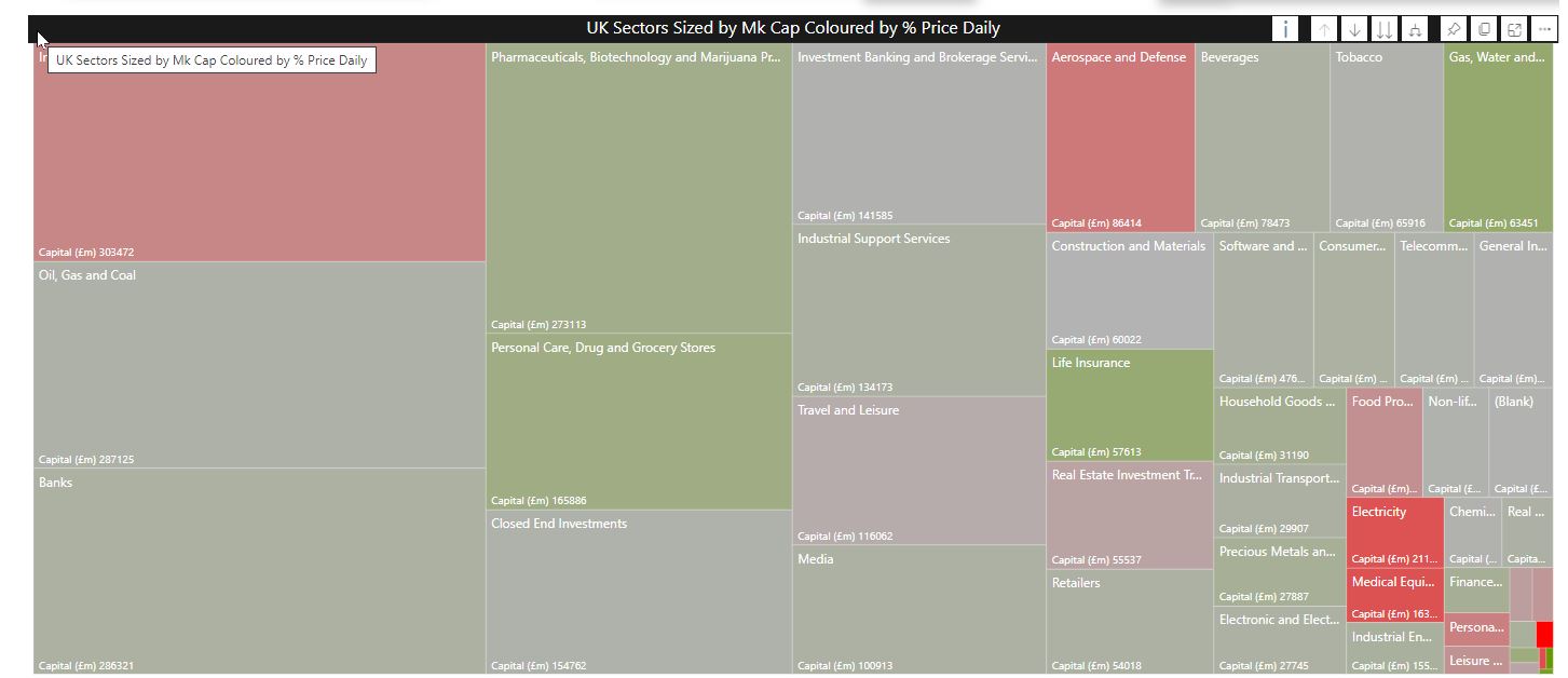 The Heat map below for the UK Universe shows fairly broad green with some weakness in mining aerospace defence and medical equipment. As mentioned in the weekly wrap, pharmaceuticals turning more bullish is key to a sustained rally ; in the past week 31 pharm names have rallied to 28 selling