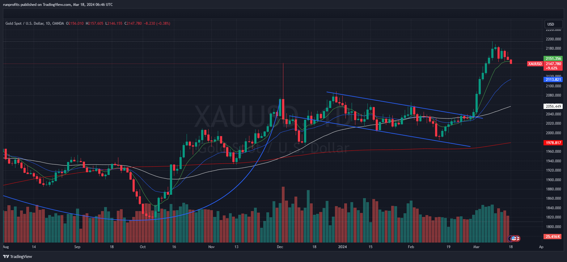 Gold showing some weakness slipping the 8 EMA to the $2148 level