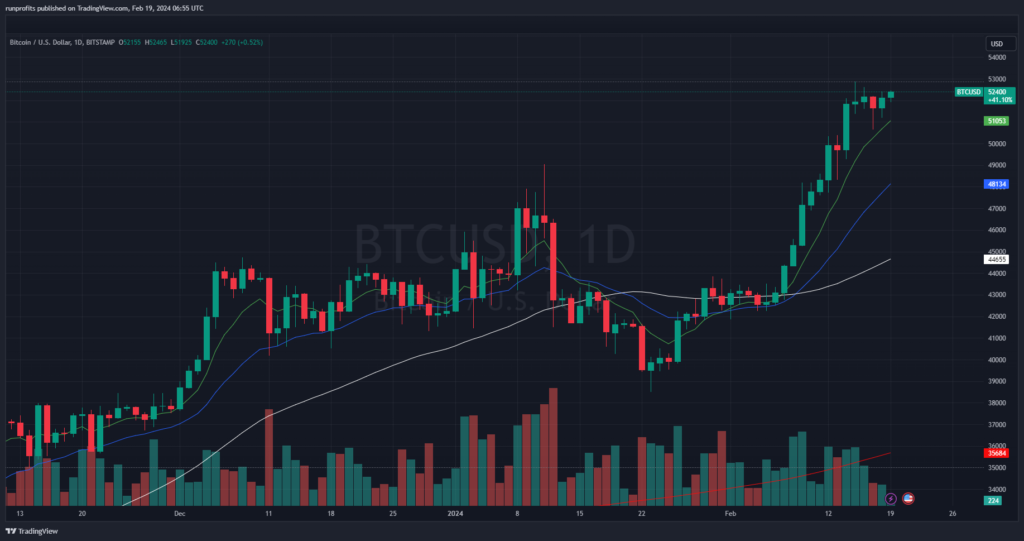 Bitocin continues its moves north after a check-in around the 8 EMA - it does look bullish but does need to clear and close the $53K area of resistance: watch ARB and UK based crypto names - I remain long