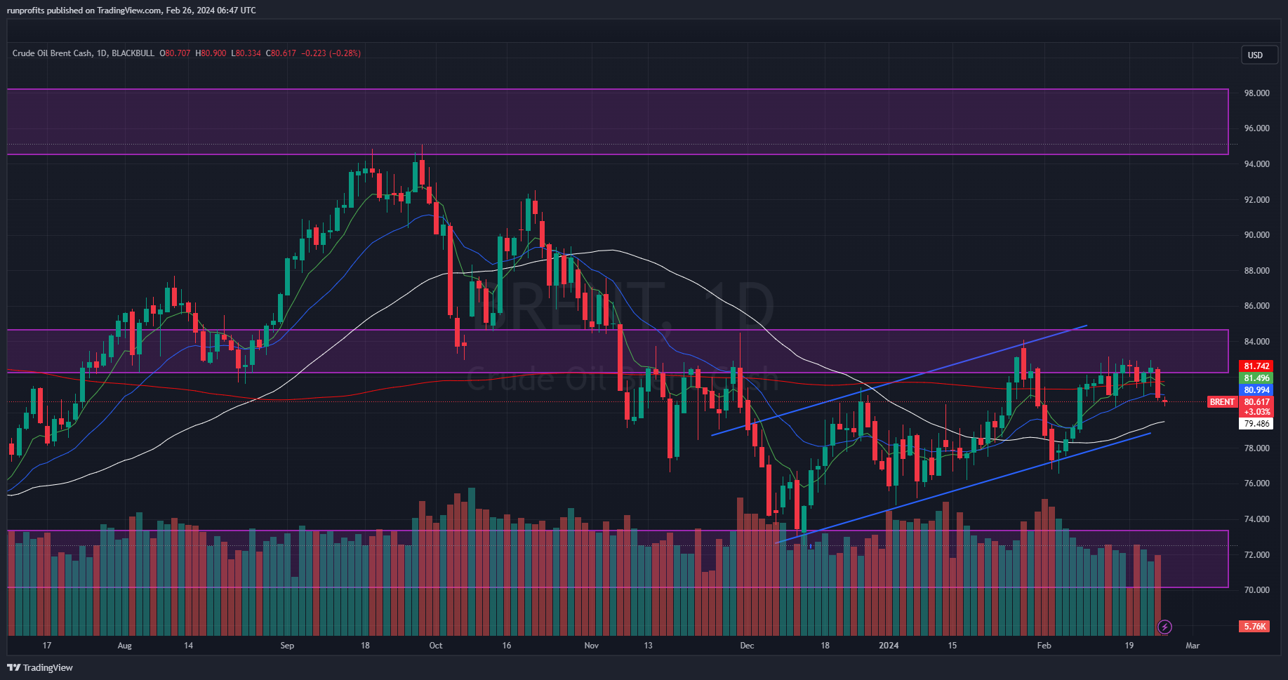 Overnight Brent oil opens lower slipping its 21EMA and looks to be heading towards the bottom of the channel: still very much rangebound