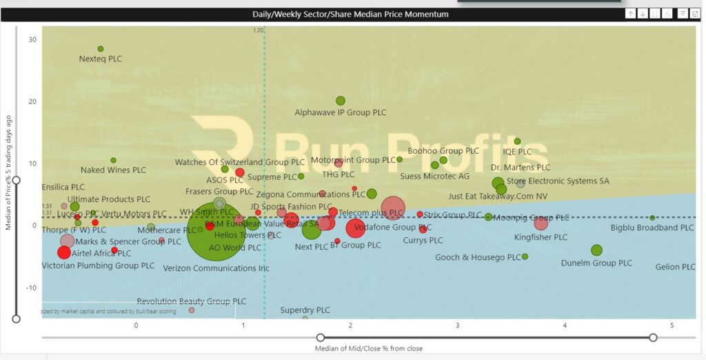 Upper right hand quadrant has Tech Hardware, Non life insurance, Telecom SPs, Retailers and Personal Goods performing well this week