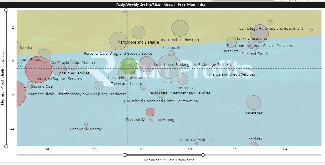 Upper right hand quadrant has Tech Hardware, Non life insurance, Telecom SPs, Retailers and Personal Goods performing well this week