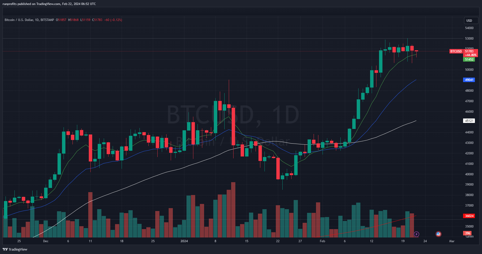 Copper remains firm and may be setting up for a move to the upside. Bitcoin continues to consolidate just below the $52,000 level and is testing but respecting the 8 EMA support