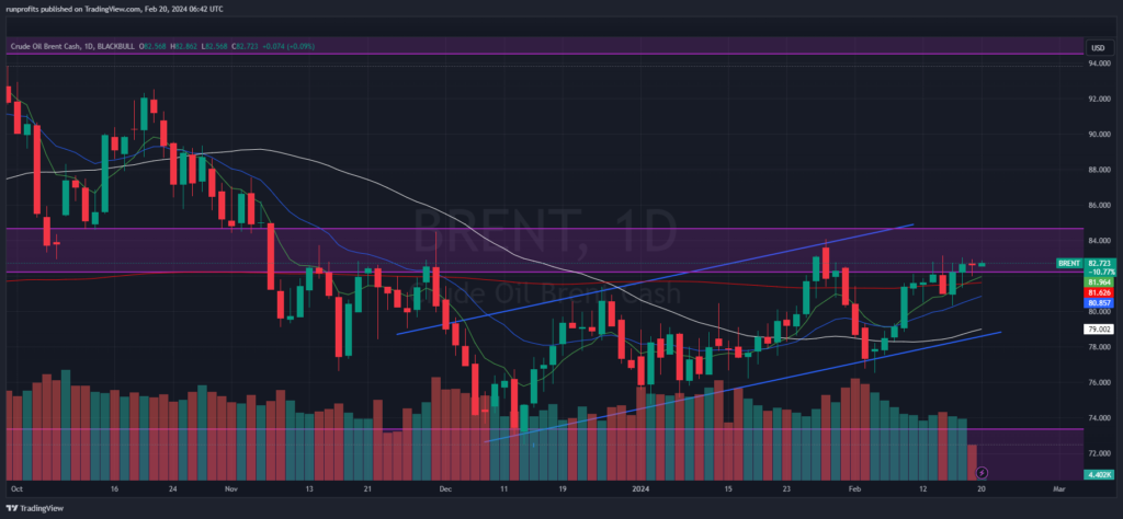 Brent crude pushes up into resistance close to the $83 level
