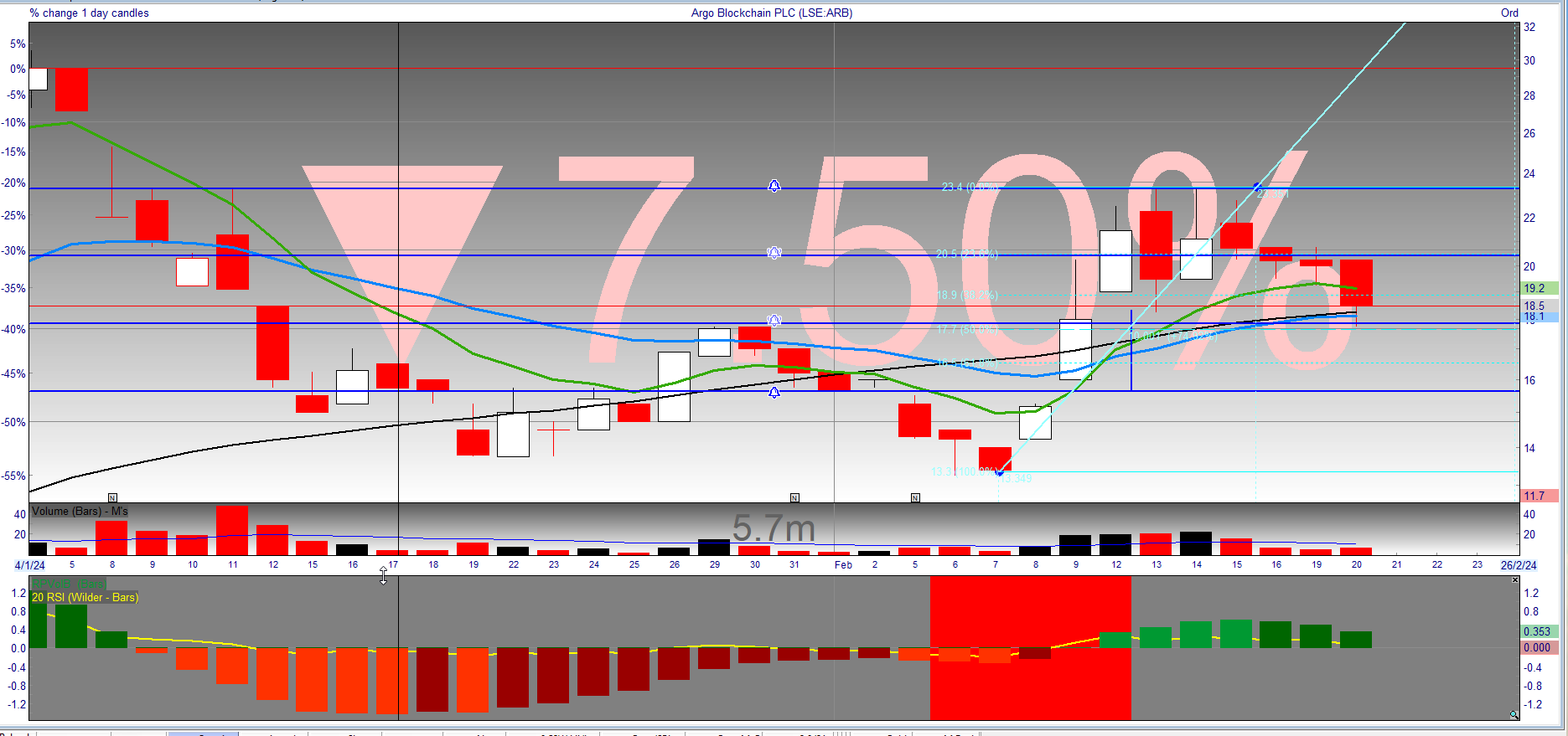 Argo Blockchain ARB - sells back 10% today - but finds support around the 21EMA which is confluent with a 50% retrace of the recent breakout - this tends to be a volatile name a bit like bitcoin so I size and manage appropriately: This may prove a good area to add though Bitcoin does remain below key resistance and can't seem to break through the $53K barrier for now: and is forming a reversal candle on the daily chart . ARB’s chart is showing increasing volume on updates and lower volume on down it days which tends to support a more accumulation type phenomenon