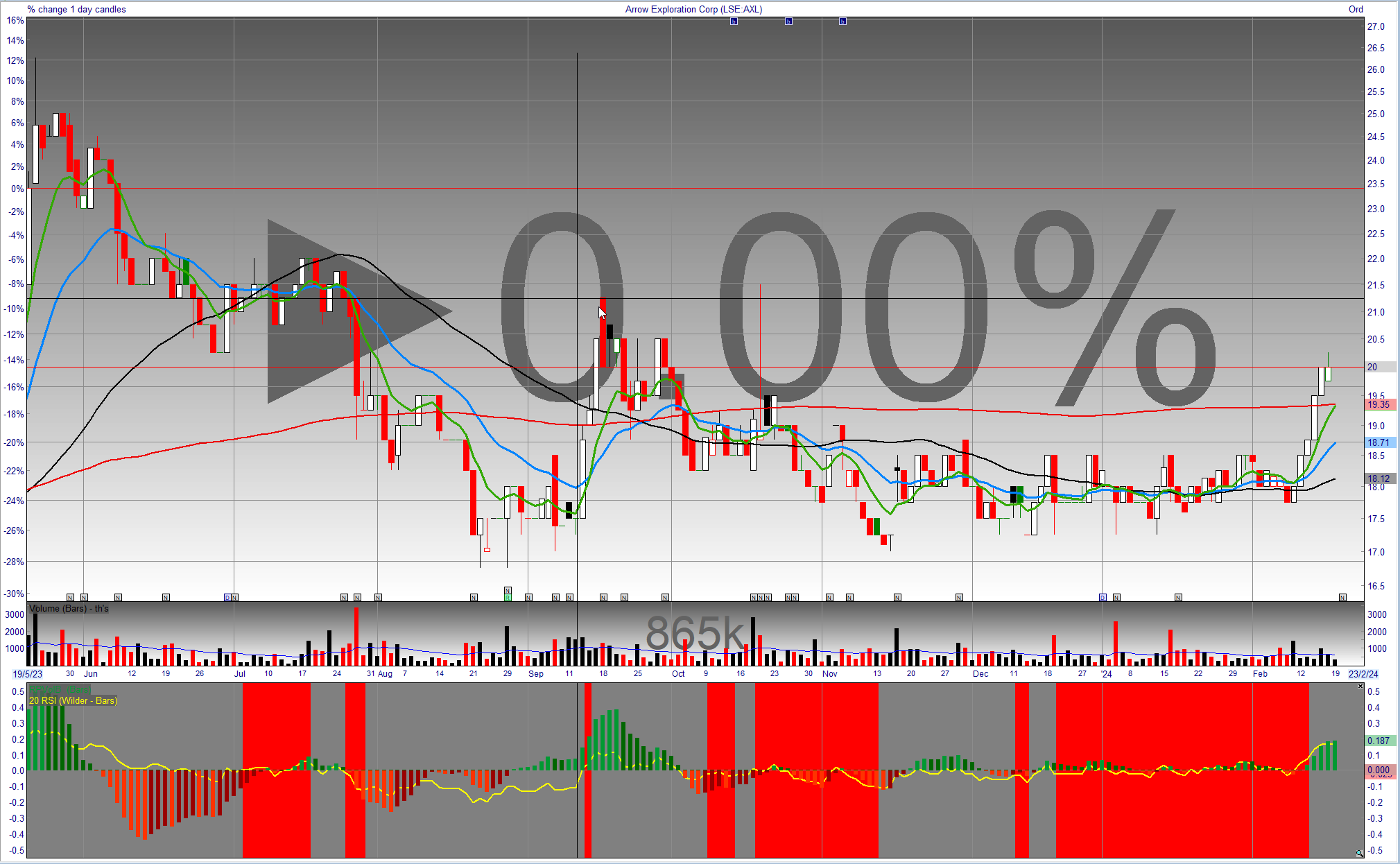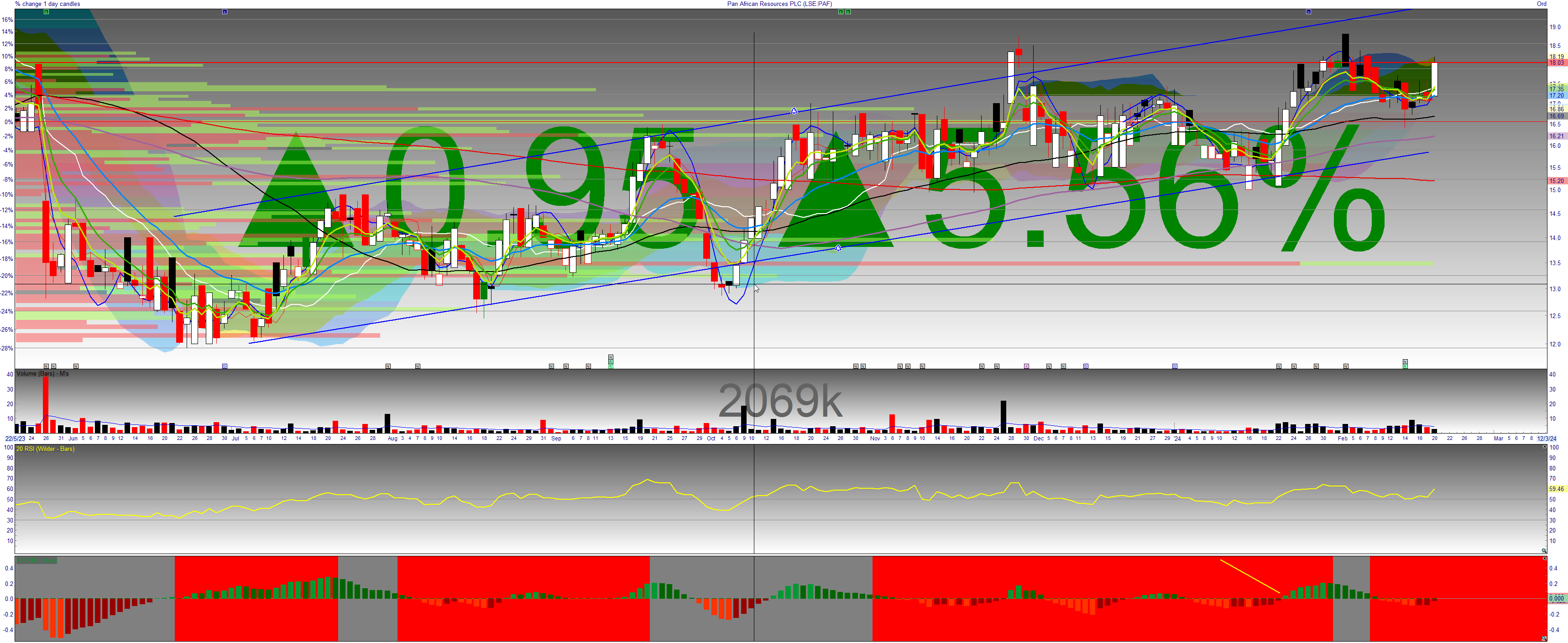 Pan African Resources (I am long) rallies 5.6% despite the down day - this has been respecting its 21EMA as support since it broken out above it on an operational update on 22 Jan 24