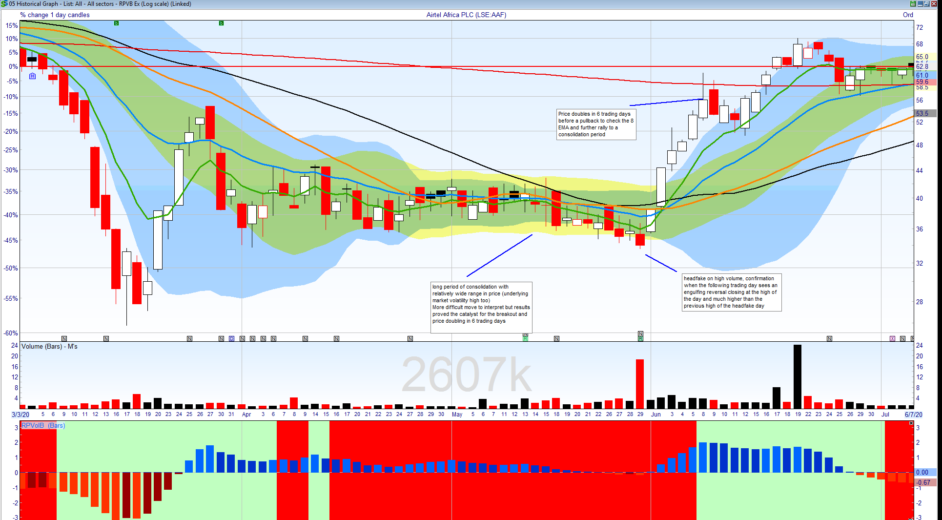 A volatility squeeze started to form in later April 2020 with the BBs contracting and dropping inside the KCs: unlike a typical volatility contraction, price volatility was somewhat elevated but compared to the earlier March, April period was significantly reduced (as was overall market volatility). AAF updated with on results on 29 May ’20 ending the consolidation period and appeared to form a short RP Vol B on high volume. However, the following trading day marked a complete reversal enclosing the headfake day and closing at the high. AAF went on to double in price in 6 trading days, such is the power of these volatility breakouts. While headfakes can be difficult to spot a few rules help