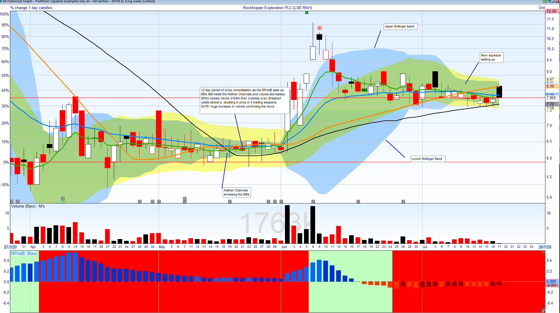 The RPVolB setup is a volatility expansion setup based on the original Bollinger squeeze setup described by John Bollinger in 2002. There have been numerous additions and improvements to the original work of which RPVolB is but one of those. The details below and supporting data on runprofits.com are used to identify volatility squeezes that occur in UK markets.