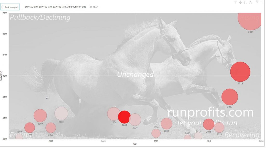 Figure 10 . FTSE 250 All Time Highs by Year (sized by market cap of shares making ATH)