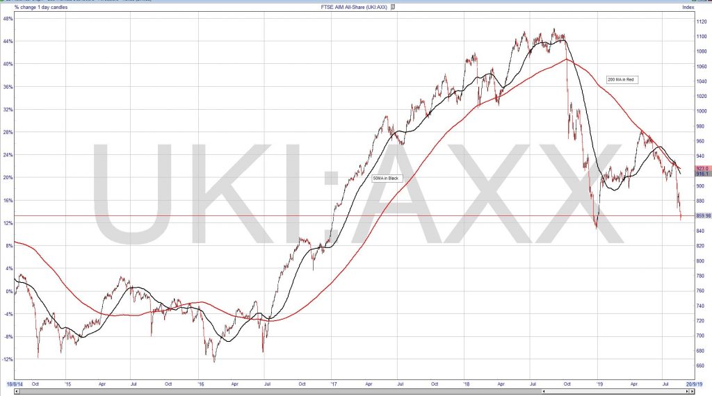 August came and with it a dramatic change in fortunes -in the past three weeks, the AIM All-Share has relinquished almost all of its gains and is 11% below its 2019 high all but  revisiting the 2018 lows  and stands 22.5% below its 2018 high. Ditto with the AIM 100 with a spectacular fall from grace by Burford with FEVR and PRSM both dropping by almost 50% from their 2018 highs. The AIM 100 is 14% below its 2019 high and almost 27% below its 2018 ATH. Given the technical definition of a bear market is a correction greater than 20% by which criteria, AIM 100 and All-Share are firmly in bear territory and behaving in very petulant ursine ways. A chart for the AIM All-Share shows that the index hasn’t broke above its 200MA for a sustained period since it lost it in Oct 2018 despite numerous attempts in May,  June and July ’19 (from which it sold-off rapidly). Worth also noting that it had consistently stayed above the 200MA since 2016