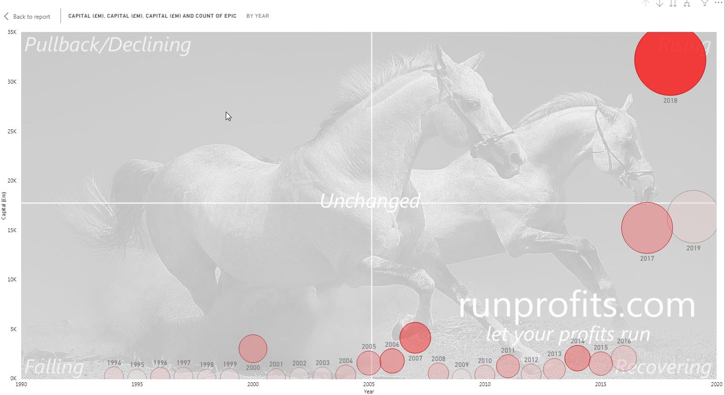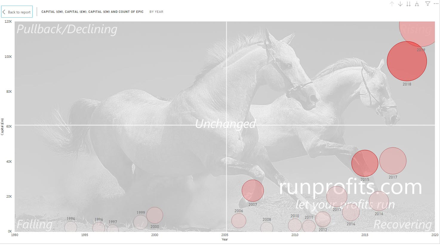 Figure 10 . FTSE 250 All Time Highs by Year (sized by market cap of shares making ATH)
