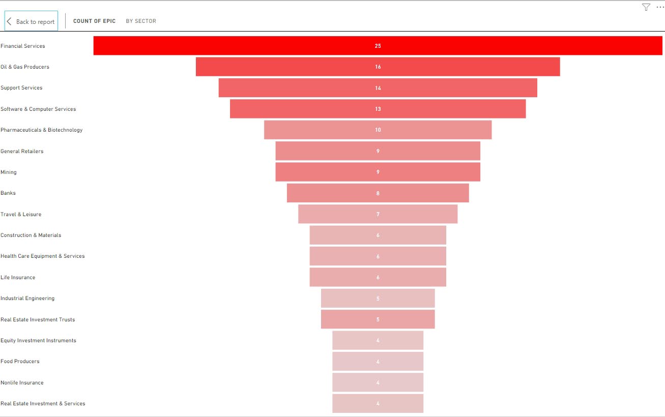 Figure 6 shows a plot of  shares that have fallen more than 10% by sector over the past month: Oil and Gas, Financial Services and Mining are the worst performing sectors reflecting the weakness in commodity prices and the fears of global slowdown. One can view these as either a clear warning to avoid these sectors or opportunities to look for bargains. Given the relatively late stage in this economic cycle. reducing weight in these sectors  is going with the flow  and the underlying commodity prices.