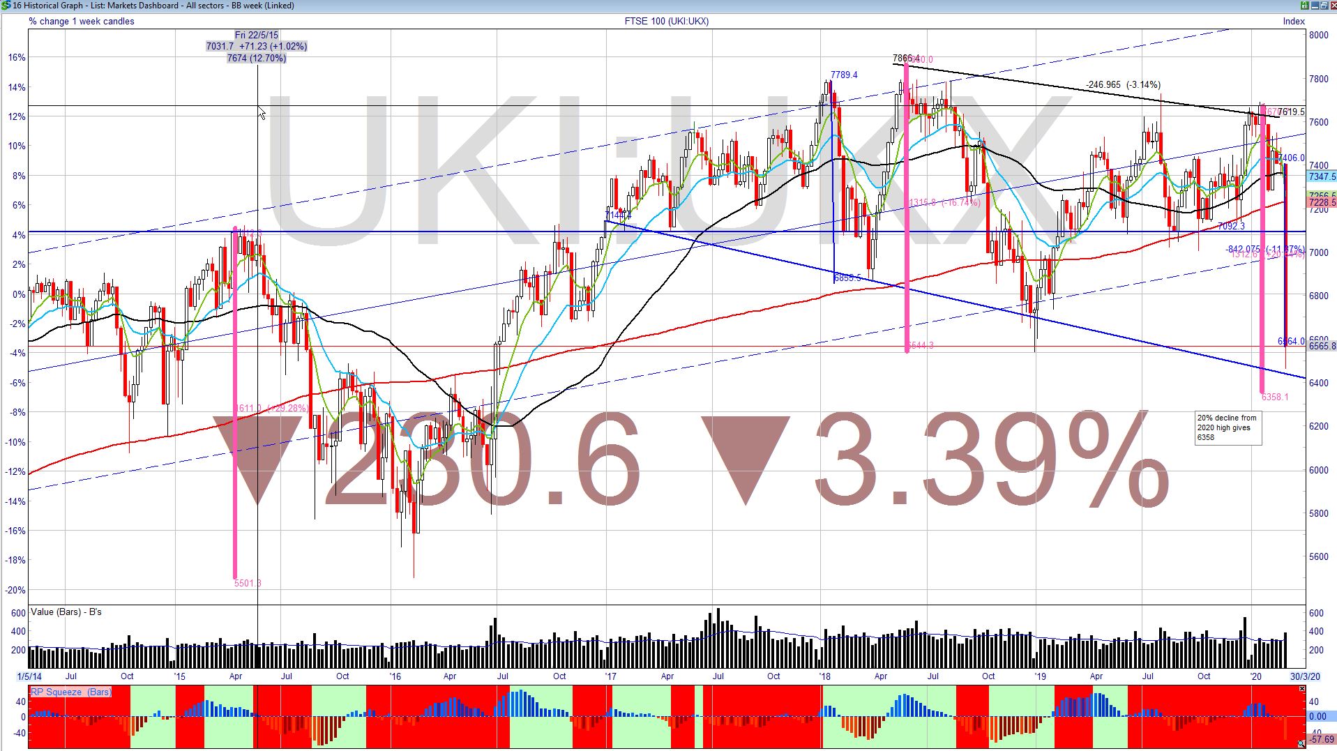 Weeks like this week are pretty extraordinary. As the pundits are putting it, one has to revisit the bad old days of 2008 and the GFC for similar tectonic movements. As we end February the weekly candle for this week shows -11.4% for the week. That is not without precedent as Oct 2008 had a weekly drop of over 21% just before the low of the financial crash. That was a 929 point drop from 4883 to 3929. As I like to say, you can't eat percentage and this week's drop in points or more poignantly ,GBP, was £842. In other words in absolute terms a value close to the biggest drop we have seen in modern history.