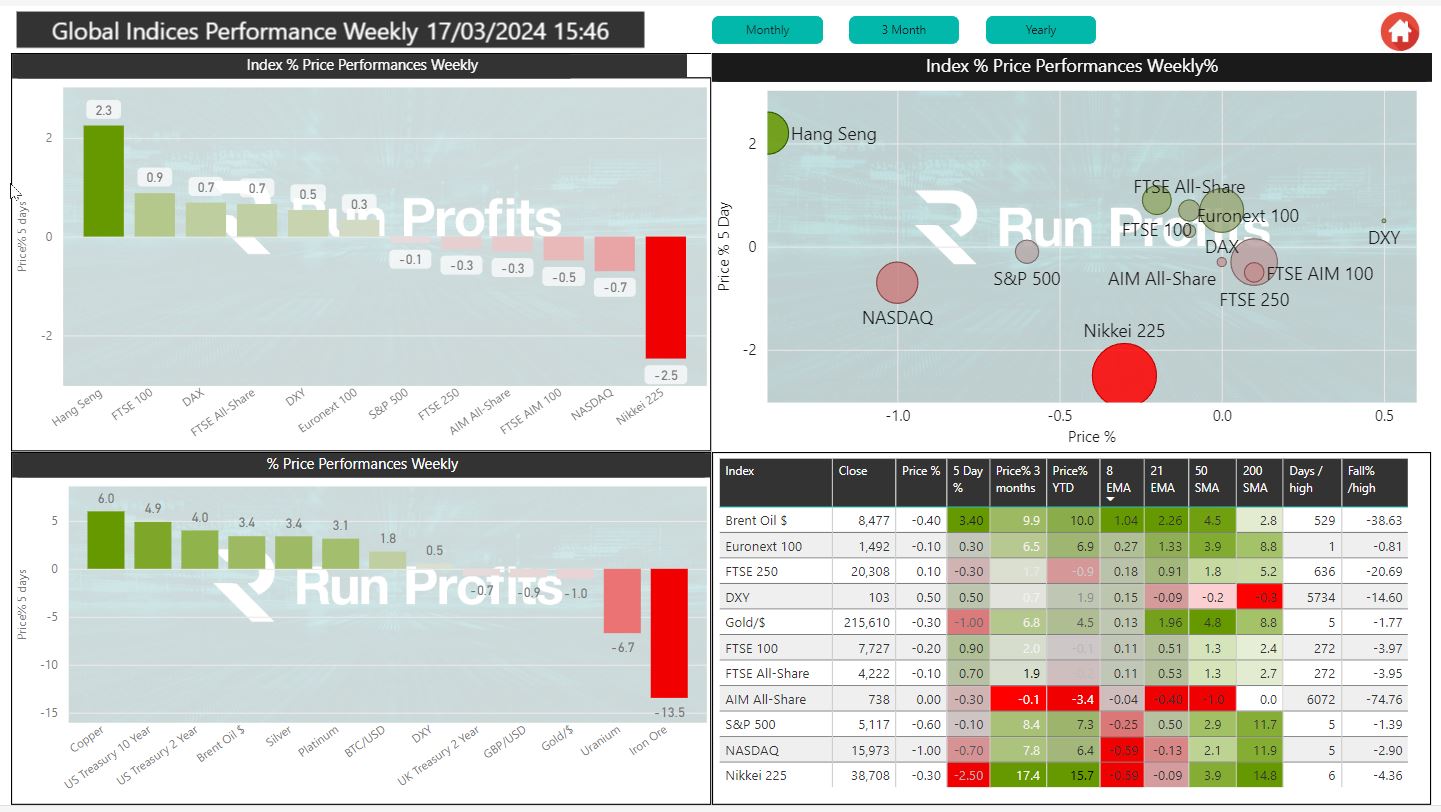 The weekly plot of global indices and commodities is shown below China led the main indices this week up 2.3 % while copper gained over 6%. These two events are linked as China remains the biggest global consumer of copper consuming over 52% of global copper volume. The FTSE100 making it the second-best performing index globally this week benefitting from a pop in resource names on the back of firmer commodities.