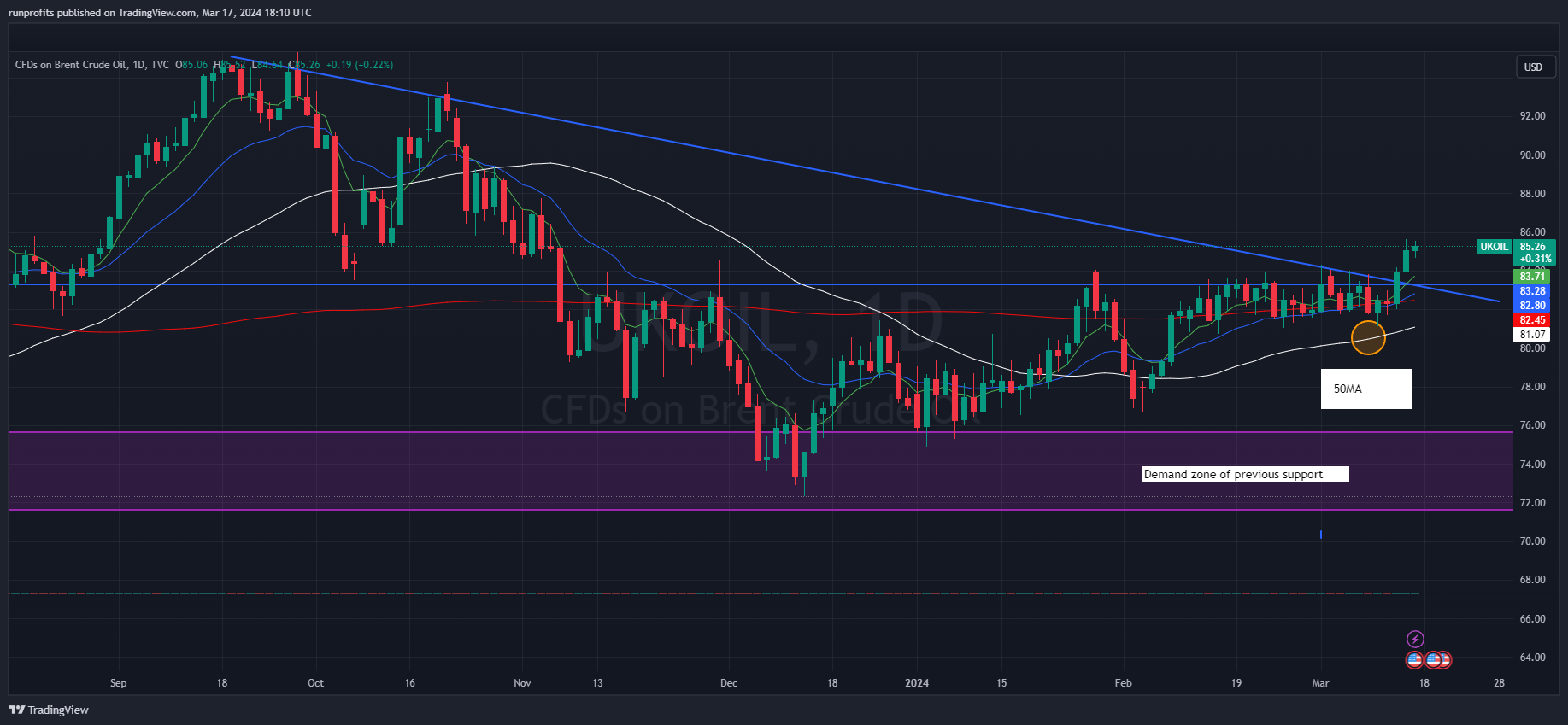 Brent Crude finally makes the break after 2 months consolidation to $85