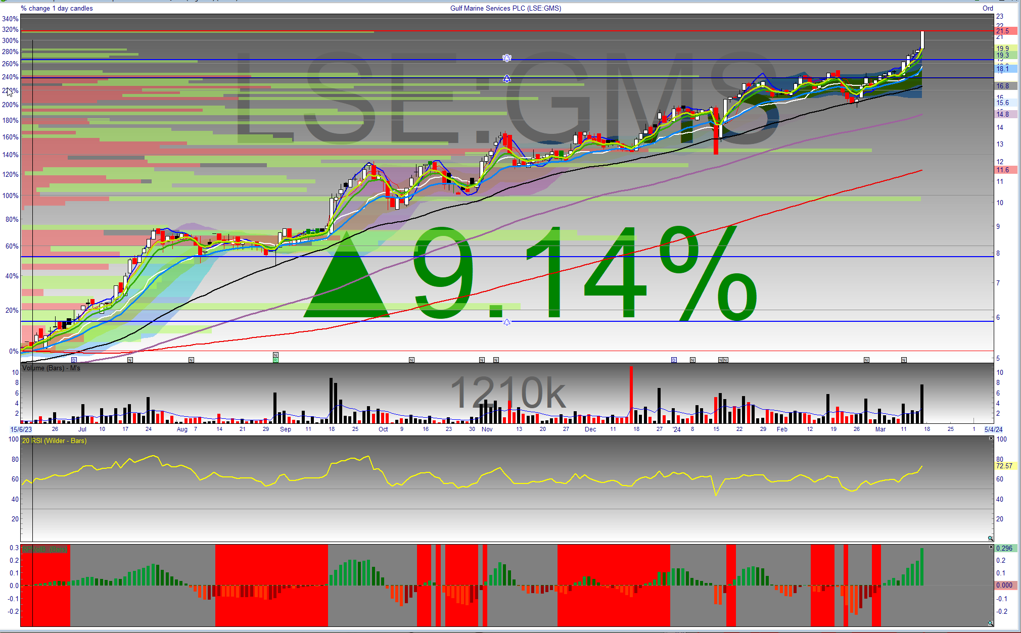 GMS Gulf marine Services – highlighted here +22.5% on the week (+15% on my entry of 0.179p) following an update on contract value with a strongly trending chart